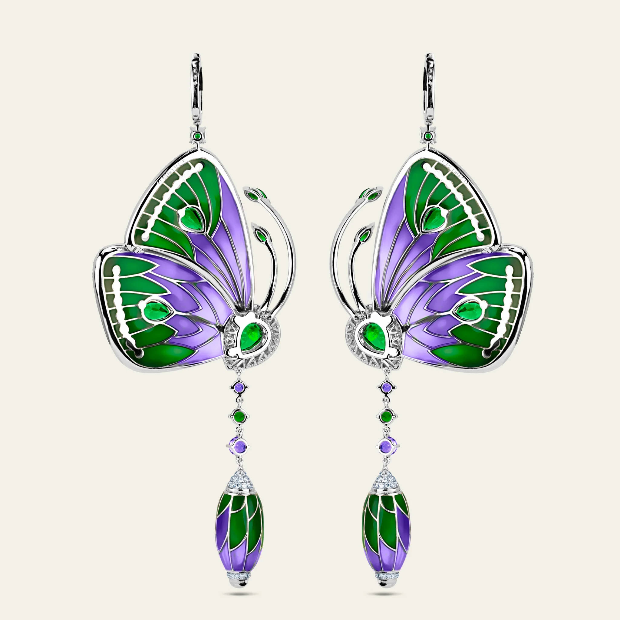 18Kホワイトゴールドにペリドット、アメジスト、ホワイトダイヤモンド、グリーン&パープルのカテドラルエナメルをあしらった手作り品