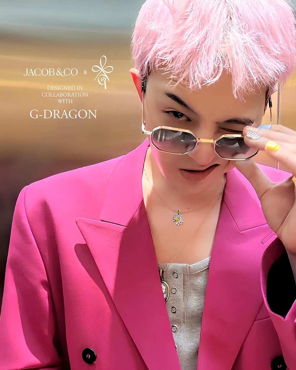 ジェイコブ&コーのシグネチャースタイルで仕立てられたPEACEMINUSONE(ピースマイナスワン) イエローサファイア ペンダントは、G-DRAGONを象徴するデイジーモチーフを再解釈したデザイン。常に進化し続ける創造性と自己表現を象徴しています。