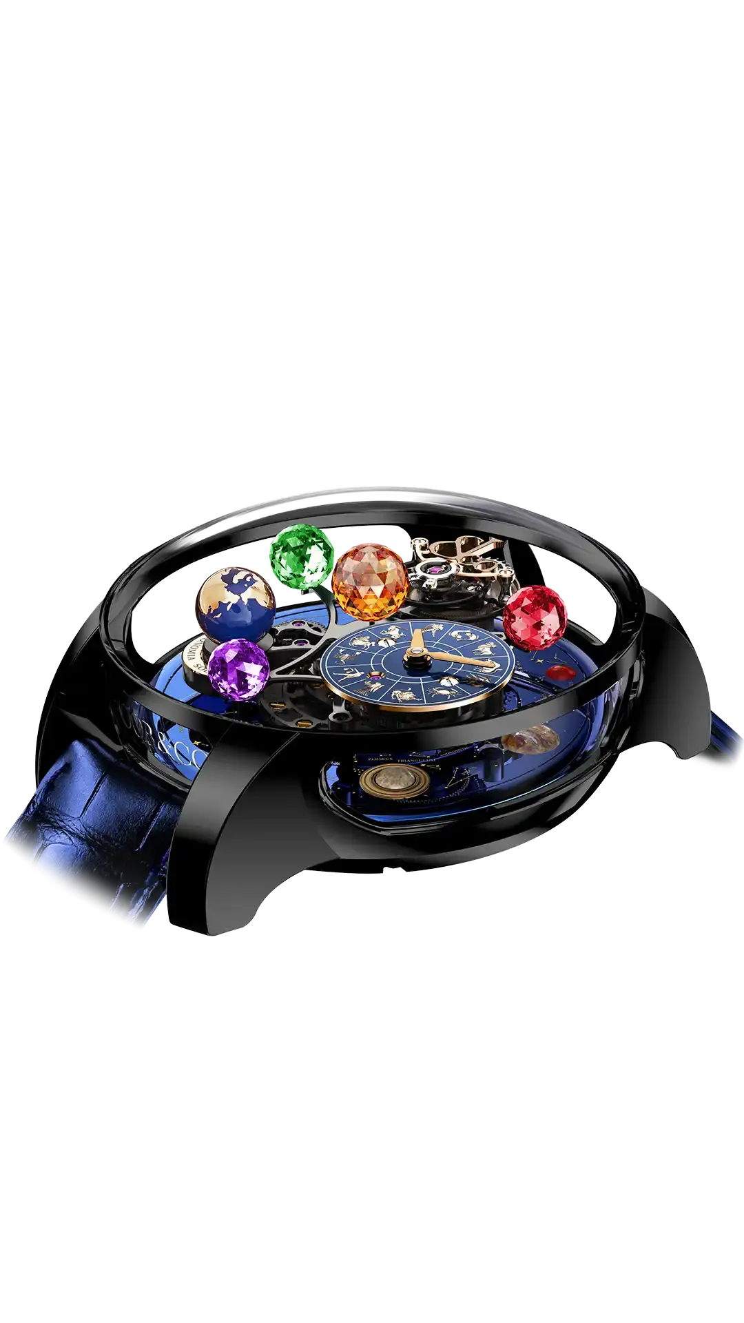 衛星アームには3つの宝石で作られた惑星がセットされており、中央の大きな太陽と同じ1回転10分のスピードで回転しています。プラットフォームの別の部分には、288面体のジェイコブカットダイヤモンドの月と、回転する地球儀が乗っています。チタン製の台座も反時計回りに10分で回転し、7つの惑星がはめ込まれています。