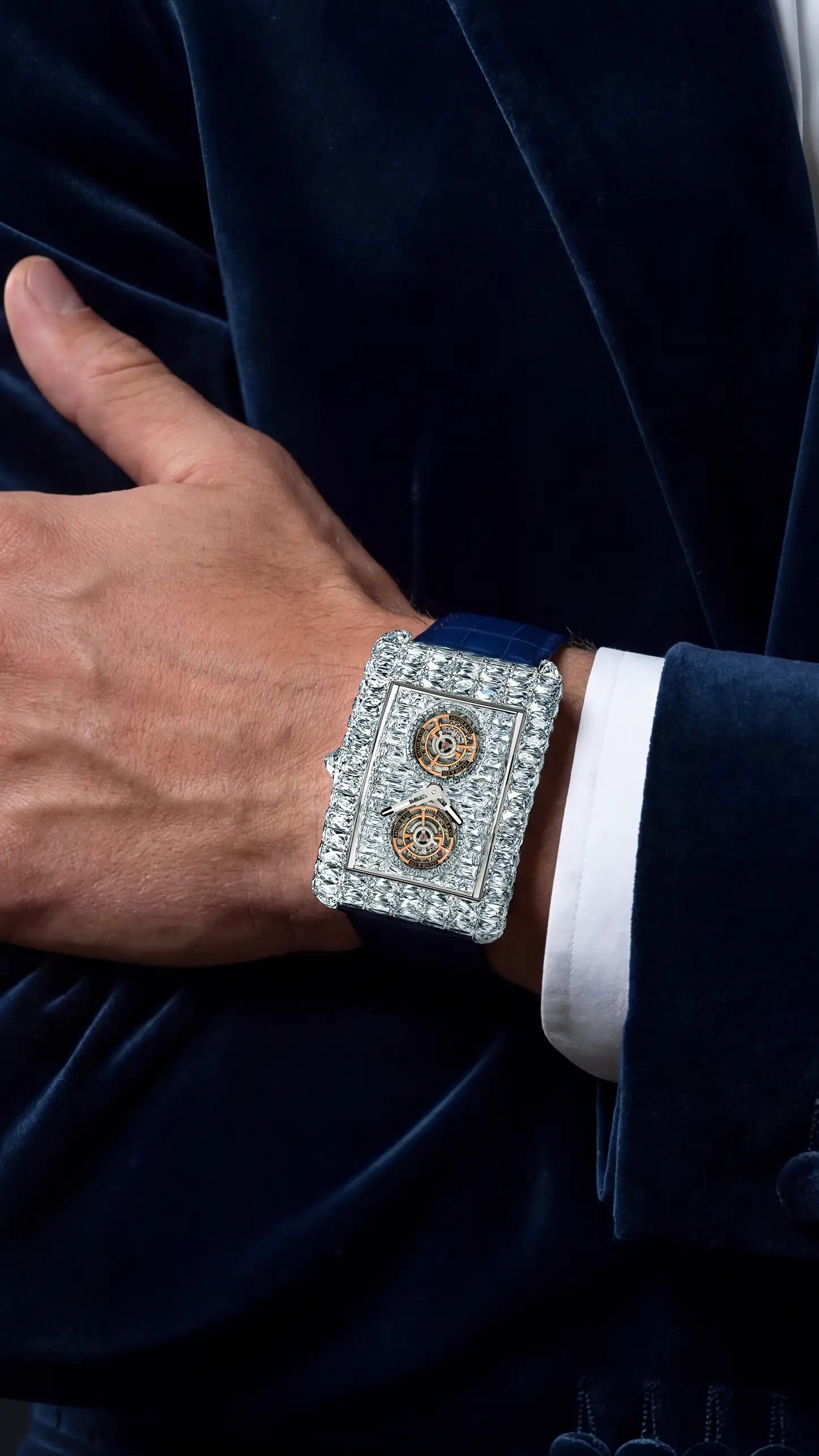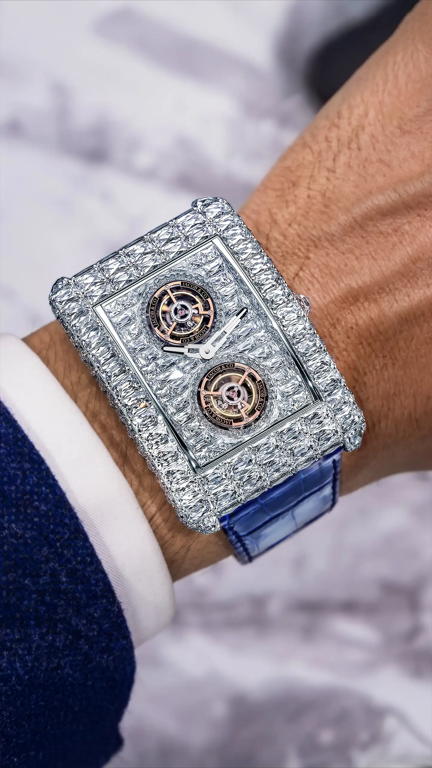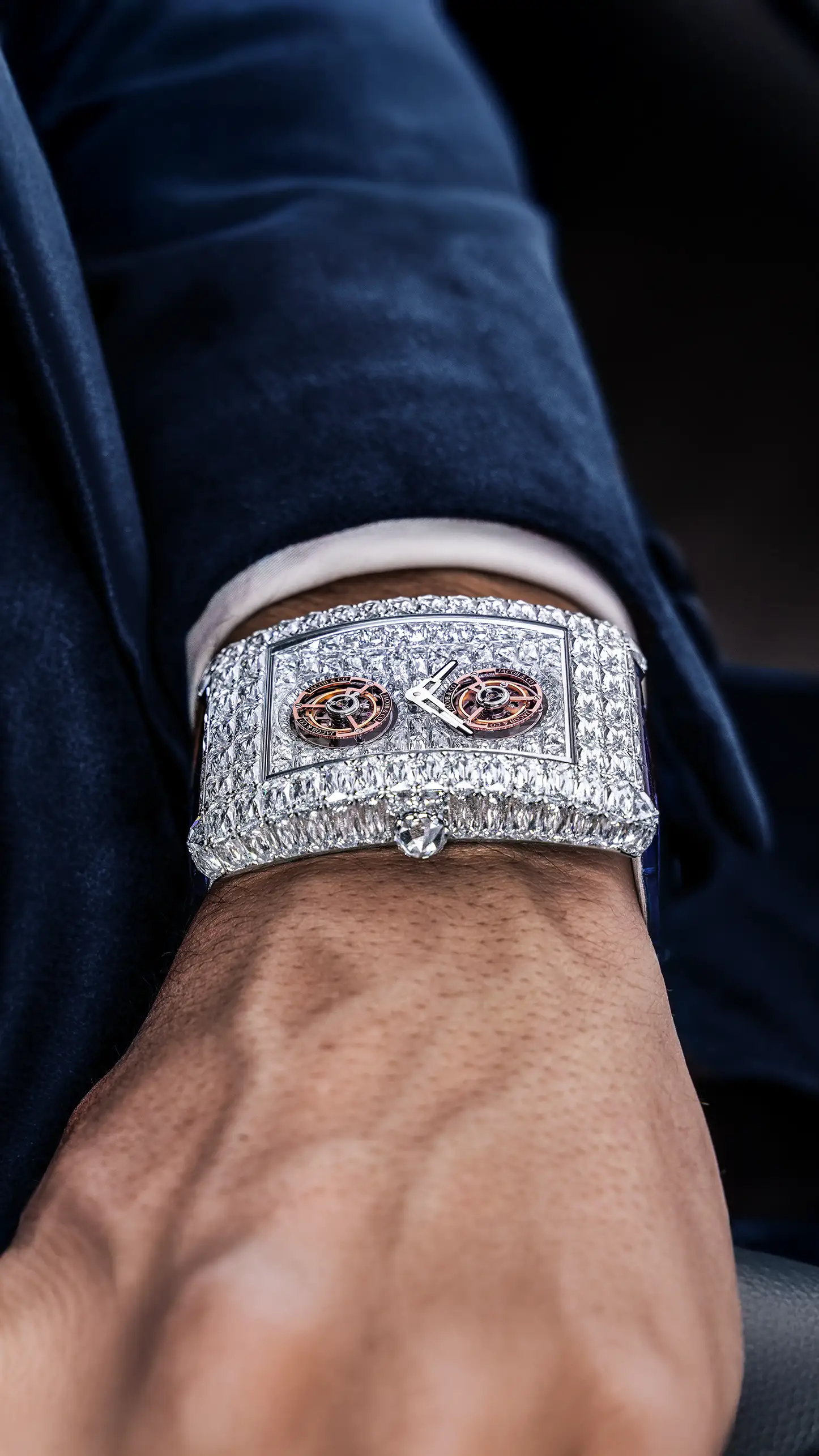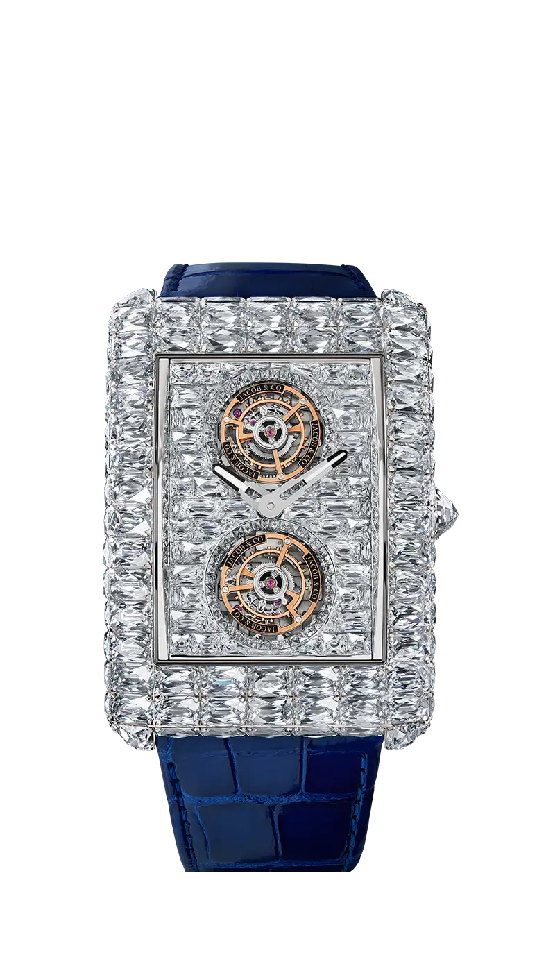 ジェイコブ&コー創業当初より、彼の中には「ダイヤモンドと時計製造、その双方が頂点に達する作品を創りたい」という構想がありました。そして2016年、その想いは結実します。極めて大粒のダイヤモンドを全面にセッティングし、スケルトン構造とトゥールビヨンを備えた一点物のタイムピース「ビリオネア」が誕生しました。その価格、使用されるダイヤモンドの規模、そしてデザインは、いずれも前例のないものであり、時計業界に衝撃を与えたこのモデルは、その後複数のバリエーションへと発展していきます。