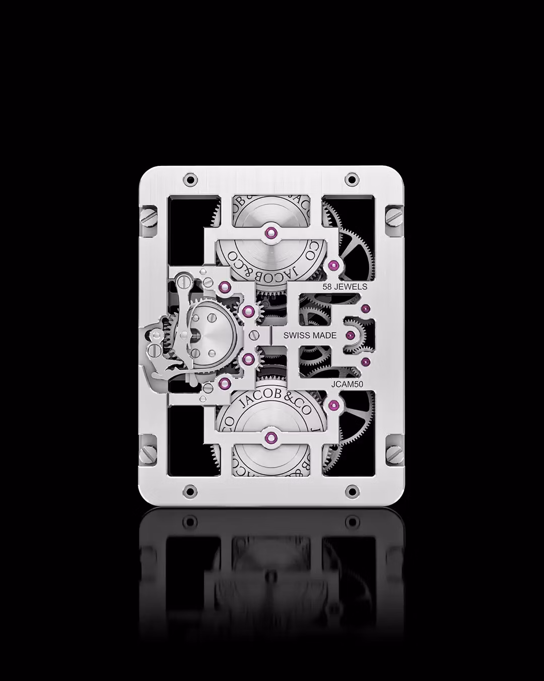 18Kホワイトゴールドケースに、エンジェルカットのホワイトダイヤモンド98石(計51.13ct)およびローズカットダイヤモンド1石をセッティング / ダイヤルには、エンジェルカットのホワイトダイヤモンド80石(計51.13ct)をインビジブルセッティング / スケルトンムーブメント / ダブルフライング トゥールビヨン / 総部品数460個 / 72時間のパワーリザーブ
