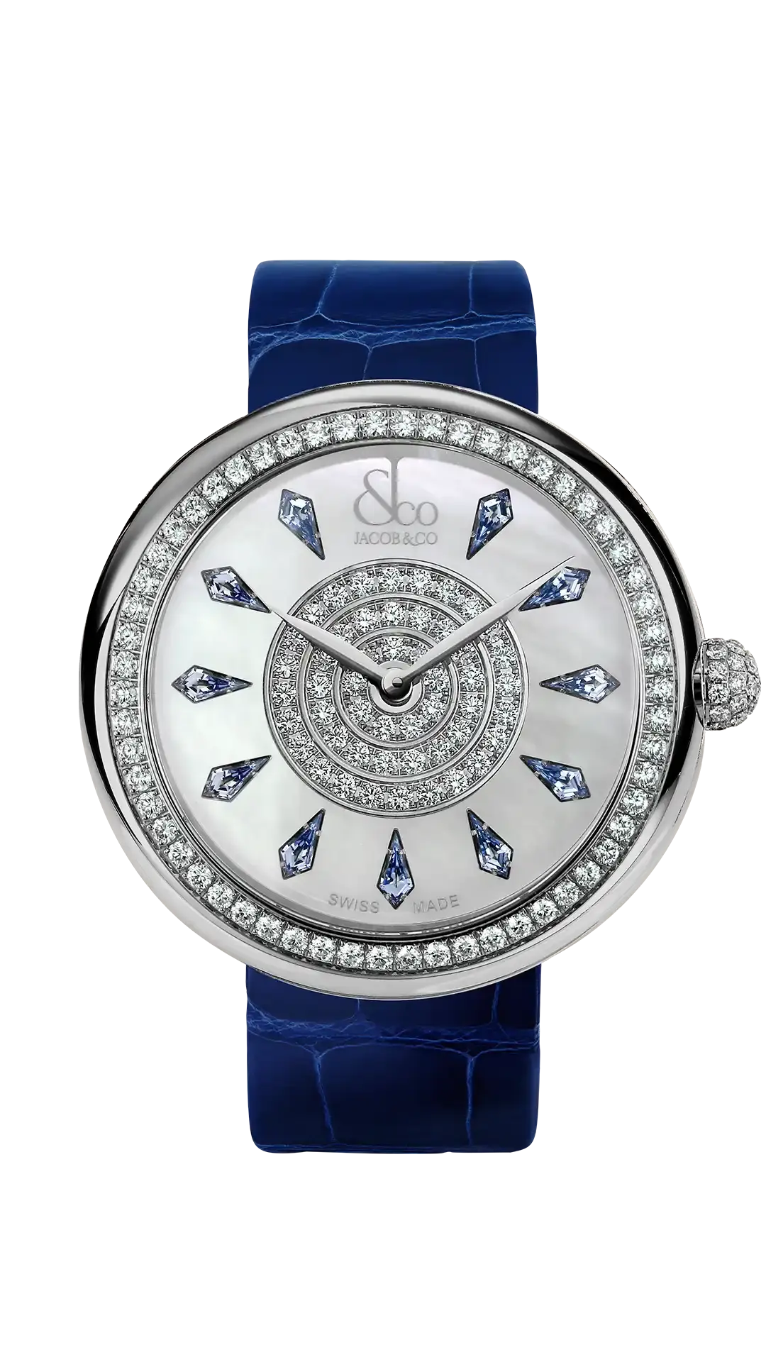 2017年、ジェイコブ&コーは他にはない新しいレディースコレクションを発表しました。ラウンド型でラグがなく、ストラップがケースに直接取り付けられているブリリアントは、普段使いができ、高級感があり、ジェイコブ&コーが愛するあらゆる宝石をマッチできるようにデザインされました。ブリリアントのマザーオブパール文字盤の中央には、ダイヤモンドをセットしたメダリオンとダイヤモンドのベゼルが配置されています。このカイトカットは非常に希少で特別なもので、ジェイコブ&コーの特徴です。その独特なカラーバリエーションは、ジェイコブ&コー最大のコレクションを生み出しました。ブリリアントは、ジェイコブ&コーが究極の女性らしさを表現したタイムピースです。