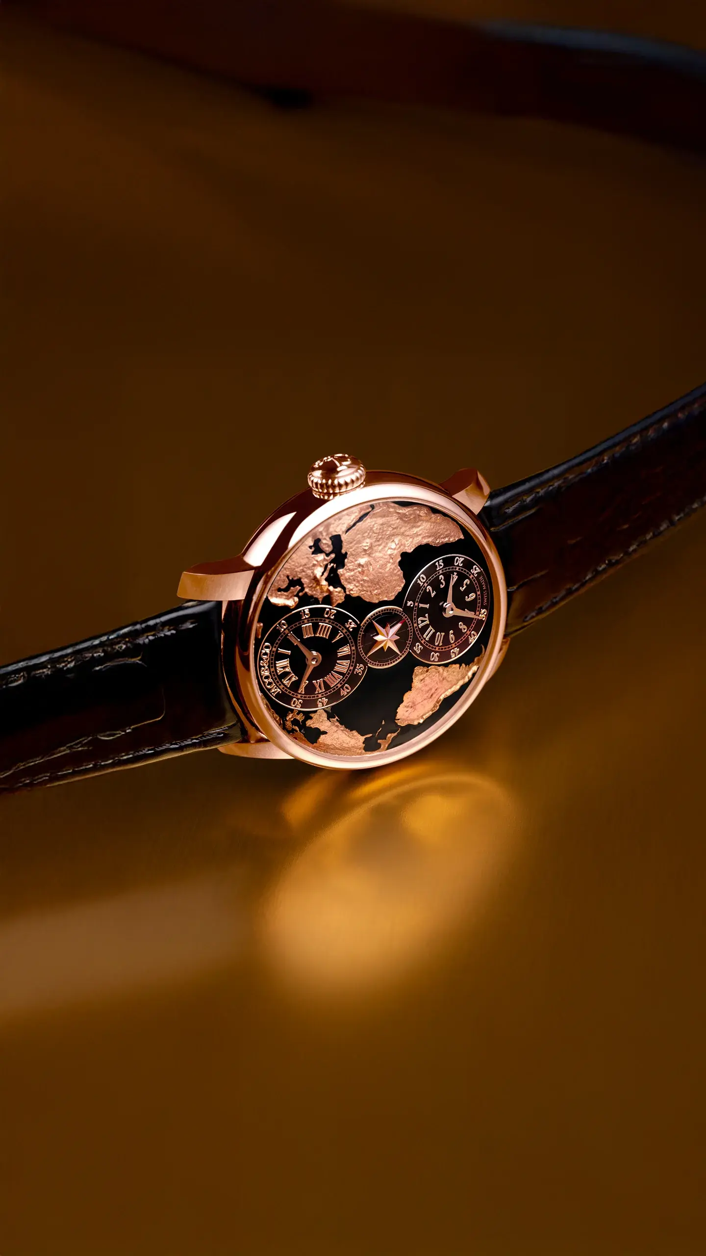 ワールド イズ ユアーズの文字盤は、地球の半分しか表していません。ケースバックは、より広く、より全体的に大陸が刻印されています。滑らかな表面には、反対側の大陸が精密にエングレーヴィングされています。高度なレーザー技術によって施されたこのエングレーヴィングによって、地球全体の表現が完成しました。